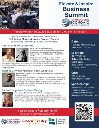 Join us at Rolling Hills Casino Event Center for the 3rd Annual Elevate & Inspire Business Summit, presented by the Red Bluff Chamber of Commerce!