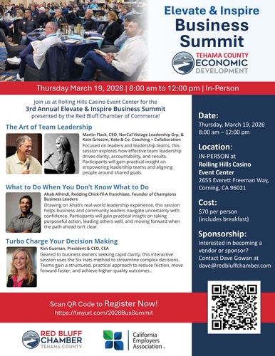 Join us at Rolling Hills Casino Event Center for the 3rd Annual Elevate & Inspire Business Summit, presented by the Red Bluff Chamber of Commerce!